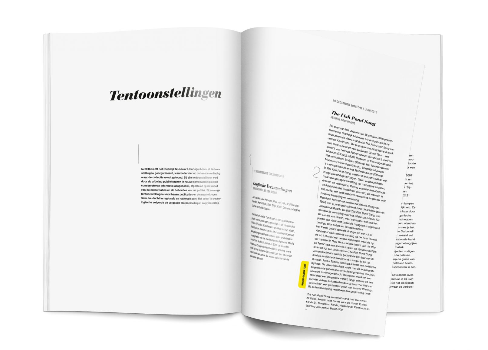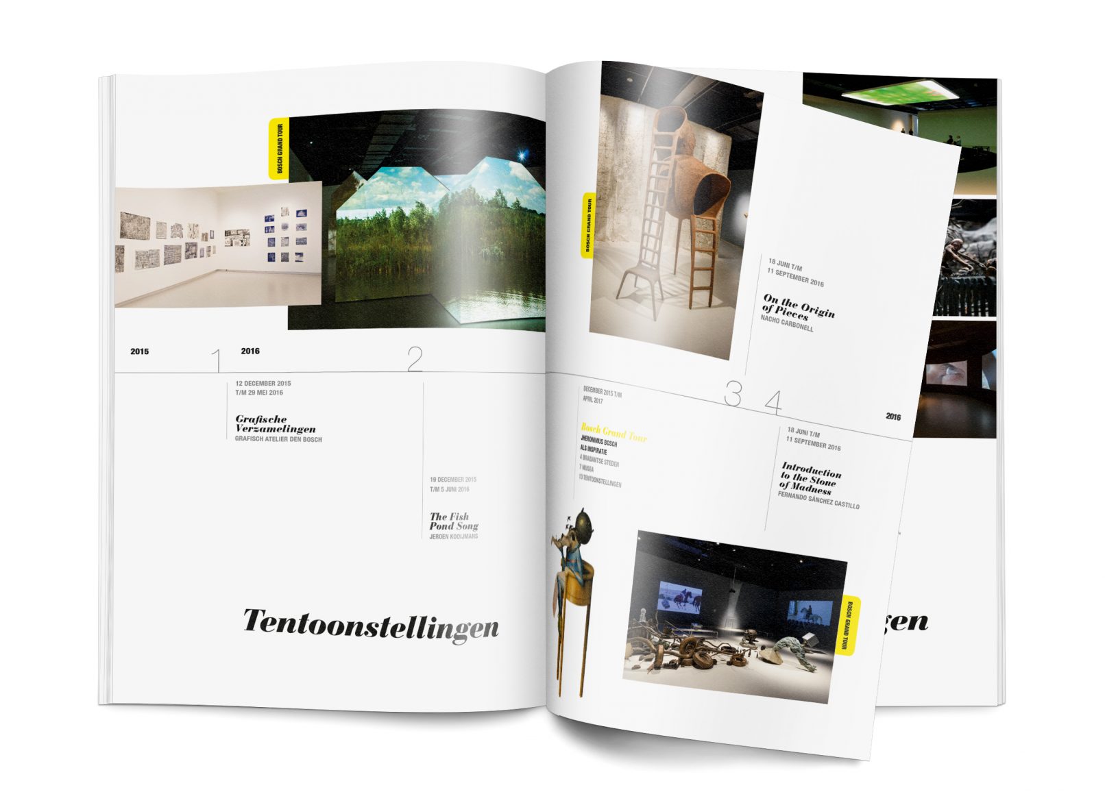 We ontwierpen een jaarverslag opgedeeld in drie stukken op basis van de tijdlijn 2016. Chronologisch werden alle tentoonstellingen, collectiepresentaties en aankopen/schenkingen getoond in zowel een visuele tijdlijn (deel1), tekst (deel2) en volledig beeld (deel2). De drie delen worden gekoppeld door corresponderende cijfers bij de desbetreffende items.